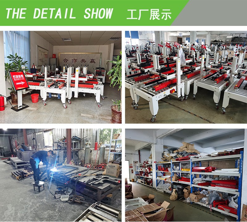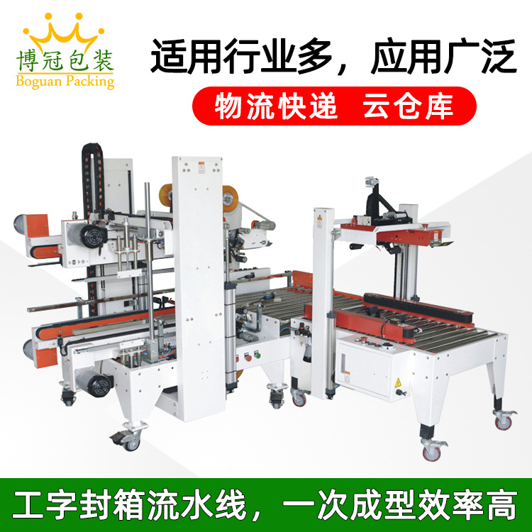 工字封箱機主要是通過機械傳動和膠帶粘貼的方式來完成封箱操作。當紙箱被輸送到封箱機的工作區(qū)域時,機器首先會將紙箱的箱蓋折疊起來,使其形成一個類似于 “工” 字的形狀。然后,膠帶供給系統(tǒng)會啟動,將膠帶從膠帶卷中引出。膠帶經(jīng)過一組滾輪或機械臂,被準確地貼合在紙箱的頂部和底部封口處,通過滾輪的壓力使膠帶牢固地粘貼在紙箱上,從而完成封箱過程。