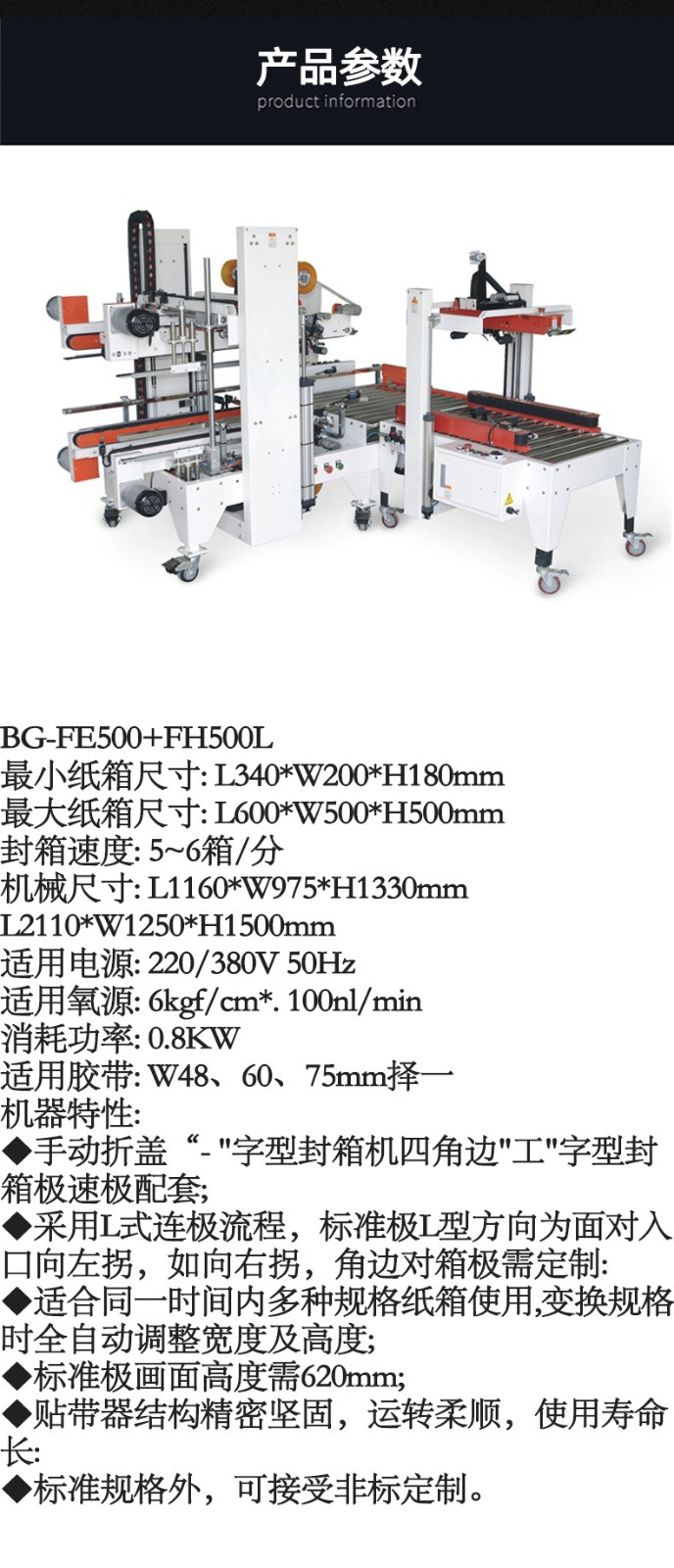 箱蓋折疊機構(gòu):這是工字封箱機的關(guān)鍵部分之一。它包括多個機械臂或擋板,當紙箱到達折疊位置時,這些部件會按照一定的順序和角度運動,將紙箱的箱蓋逐步折疊起來。例如,先將兩側(cè)的箱蓋向中間折疊,然后再將頂部的箱蓋向下折疊,形成 “工” 字形狀。