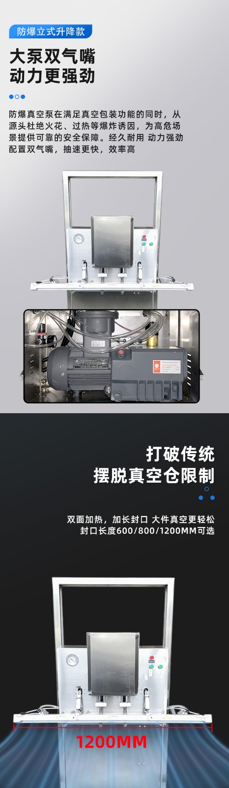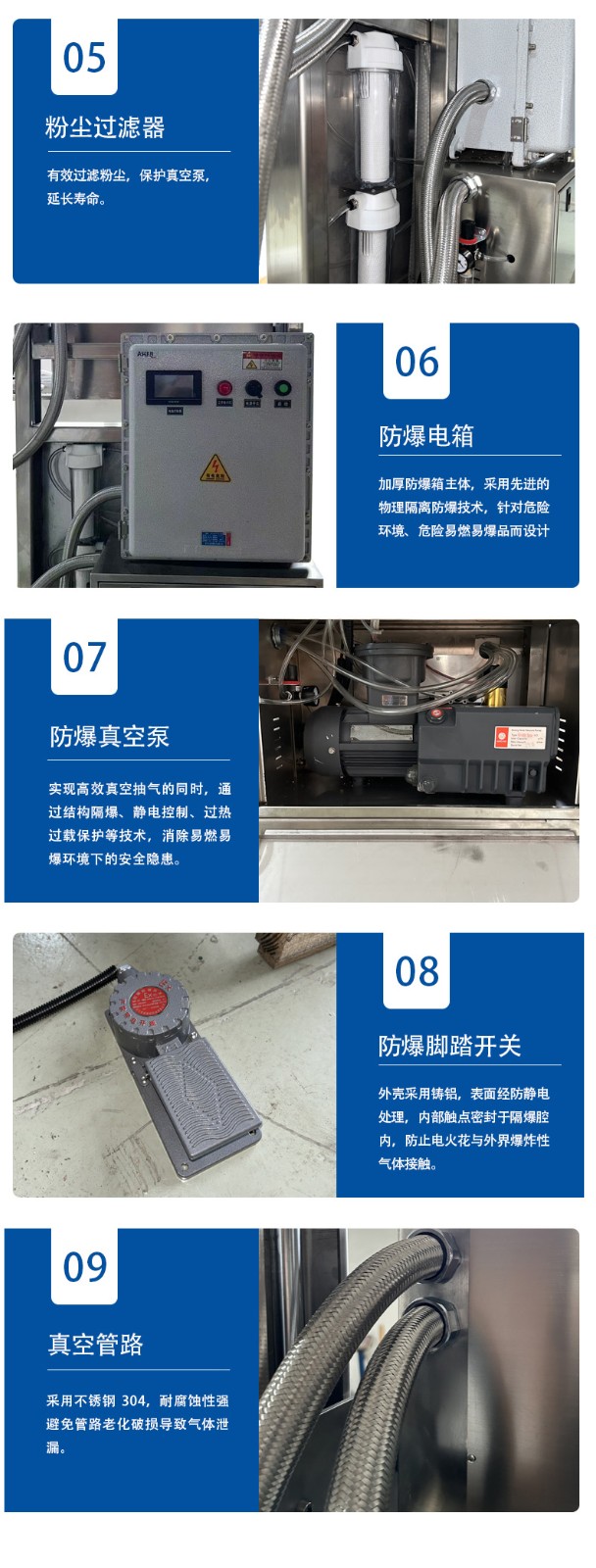 - 防爆性能優(yōu)越:采用物理隔離防爆技術(shù),嚴(yán)格選用防爆達(dá)標(biāo)元件,電器箱、真空泵、熱封條等都經(jīng)過特殊的防爆處理,能有效防止在操作過程中產(chǎn)生火花,避免爆炸等危險情況的發(fā)生2。